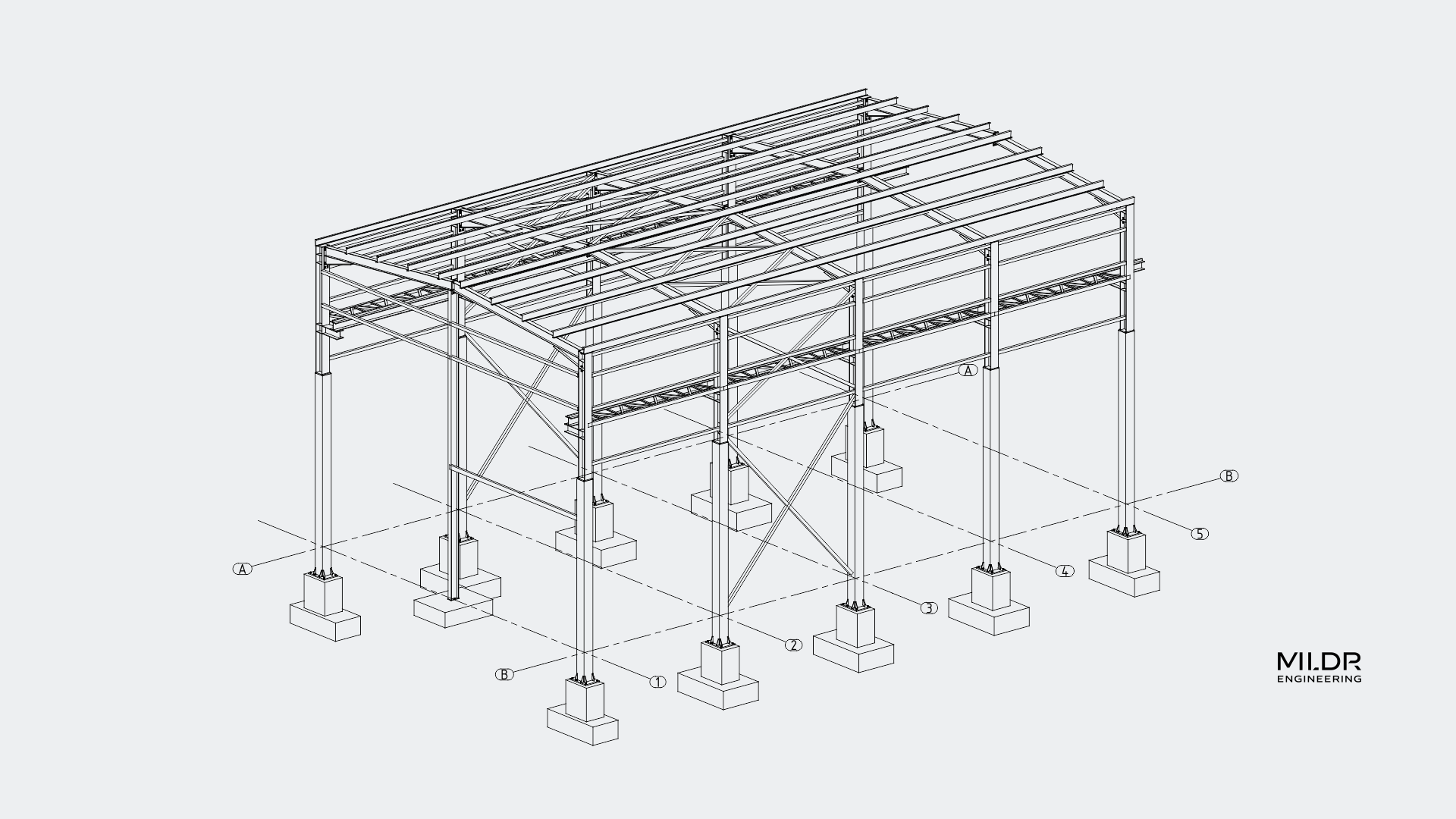Pro novostavbu haly tryskače jsme zpracovali kompletní projektovou dokumentaci ve všech stupních – od studie přes DSP a DPS až po výrobní dokumentaci. Projekt zahrnoval posouzení ocelových a betonových konstrukcí objektu. Ocelová konstrukce haly je založena na pilotách, opláštění stěn a střechy je navrženo ze sendvičových panelů Balex. Střešní nosný systém je řešen pomocí technologie METSEC. Součástí haly je lehký mostový jeřáb s nosností 8 t. Výrobní dokumentace byla zpracována v souladu s požadavky třídy provedení EXC2.